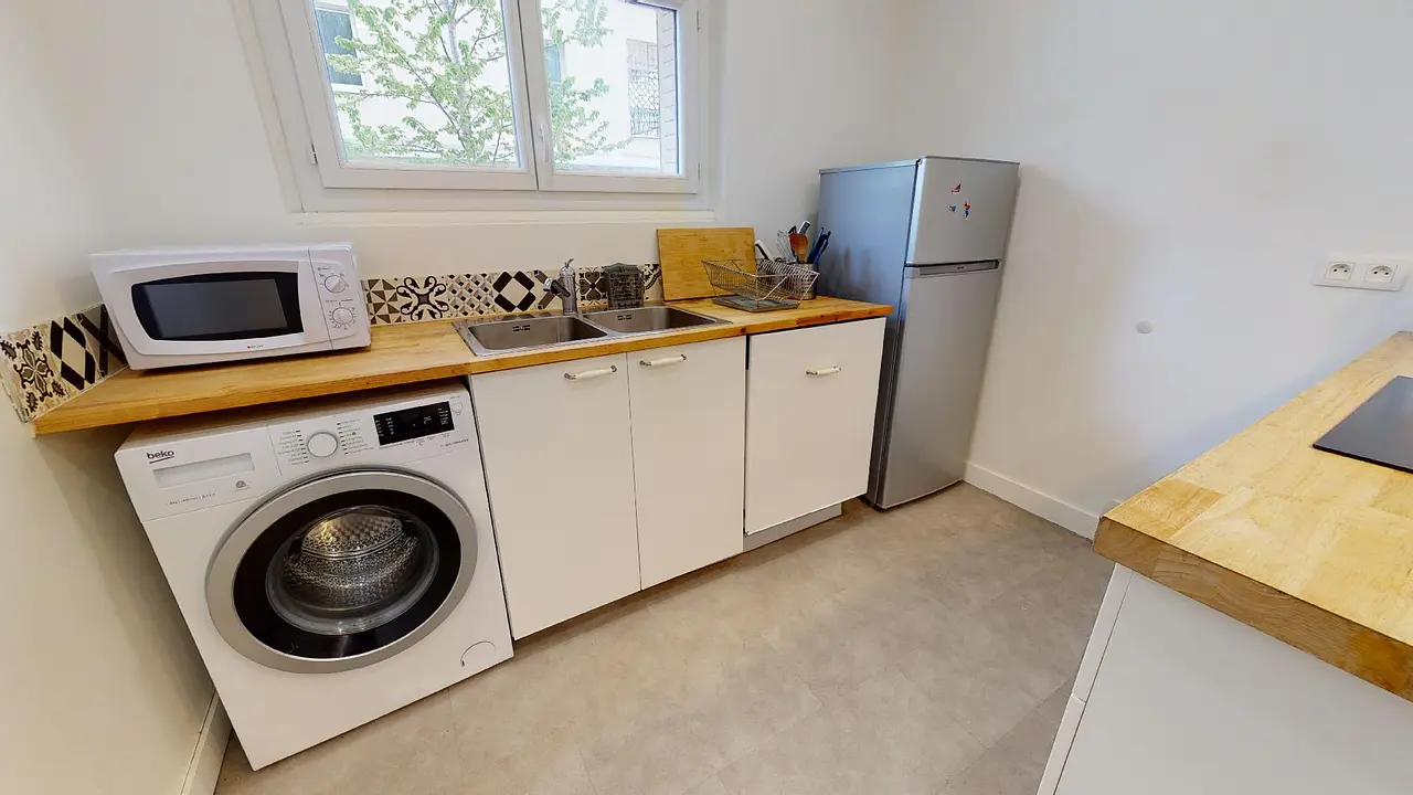 Cuisine ouverte et entièrement équipée (dont machine à laver)