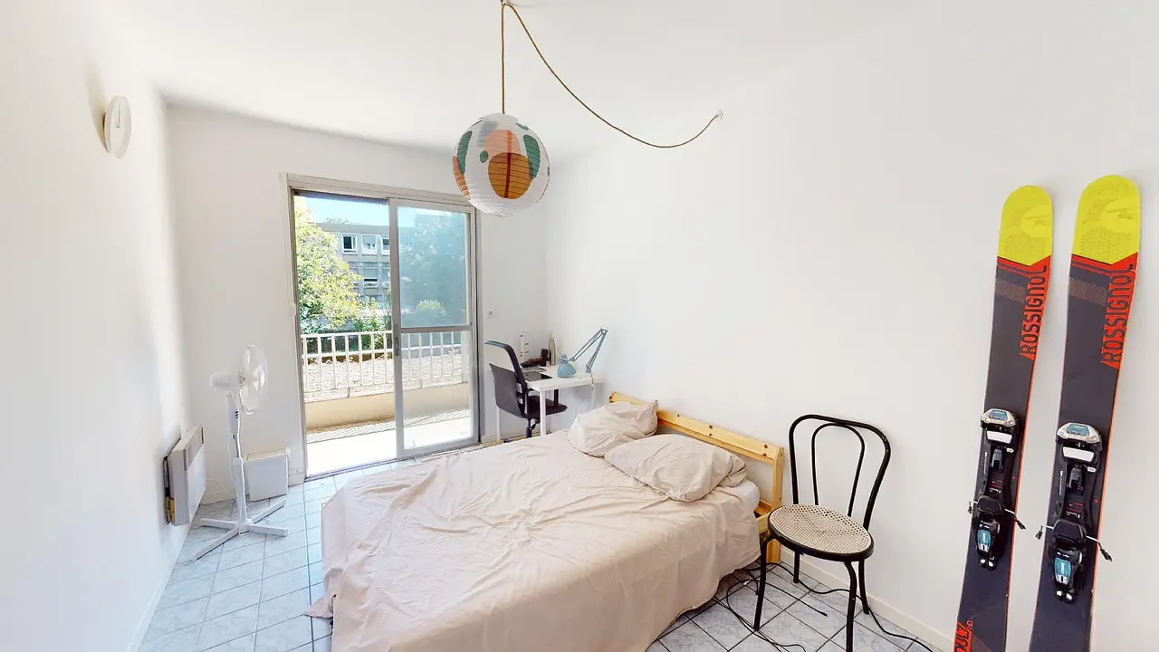 La colocation comporte donc 3 chambres toutes équipées de lits doubles, de bureaux, de chaises et des rangements. Certaines des chambres offrent un accès à un grand balcon filant.