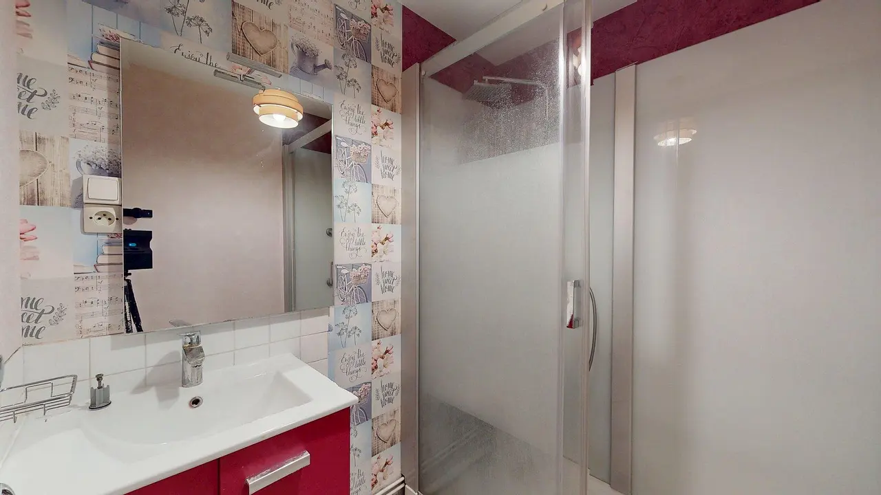 Une salle d’eau moderne avec cabine de douche et meuble vasque complète le logement. Des toilettes séparées sont également présentes.