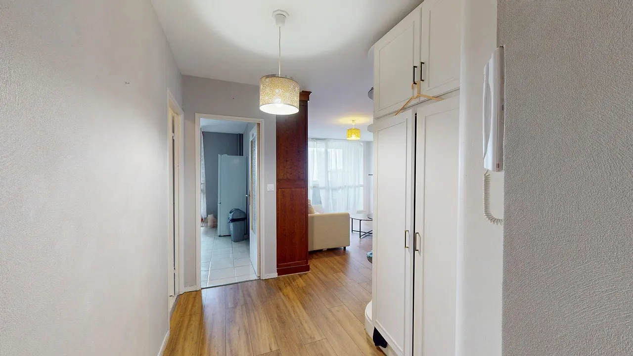 L’appartement s’ouvre sur une entrée pratique avec rangements, donnant accès à un séjour lumineux. La pièce de vie est meublée d’un canapé confortable, d’une table basse et d’un meuble TV, le tout donnant sur de larges baies vitrées qui laissent entrer la lumière naturelle.