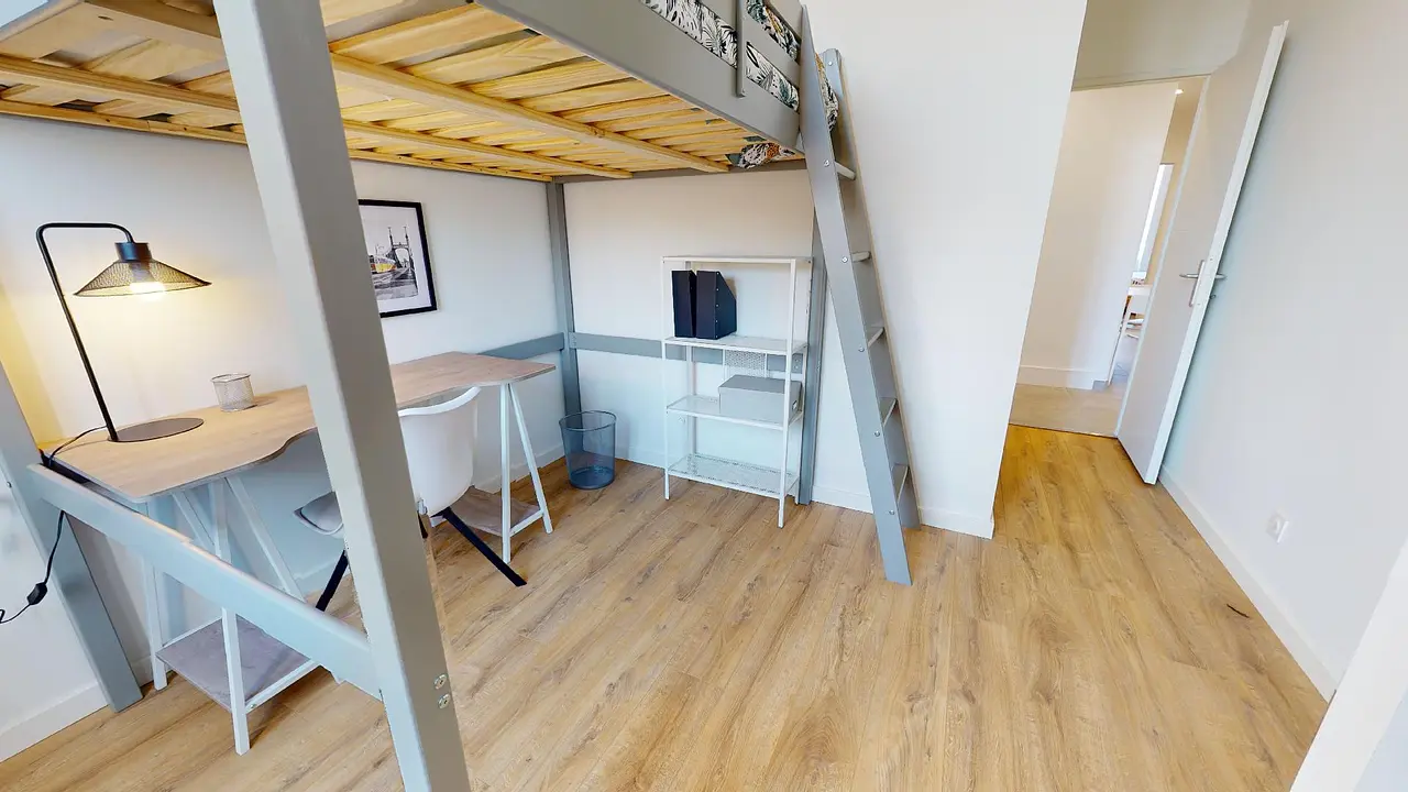 La chambre 3 lumineuse est aménagée avec un bureau, une chaise et un placard de rangement intégré.