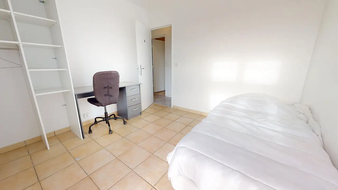 La chambre 2 de 9m2 comporte un lit simple, un bureau et sa chaise de bureau, ainsi que d’un placard intégrée. Elle offre une belle luminosité grâce à son exposition sans vis à vis.