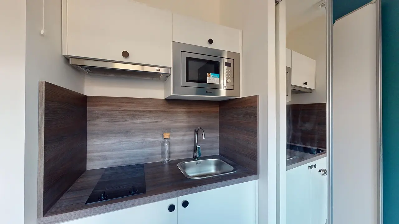 Ce studio s'ouvre sur une pièce de vie aménagée d'un lit gigogne convertible en lit deux places, d'une table basse, d'un meuble TV et d'un meuble à étagères. La cuisine ouverte est équipée d'un petit réfrigérateur, d'un micro-ondes, de plaques de cuisson avec une hotte, d'un évier ainsi que des rangements.