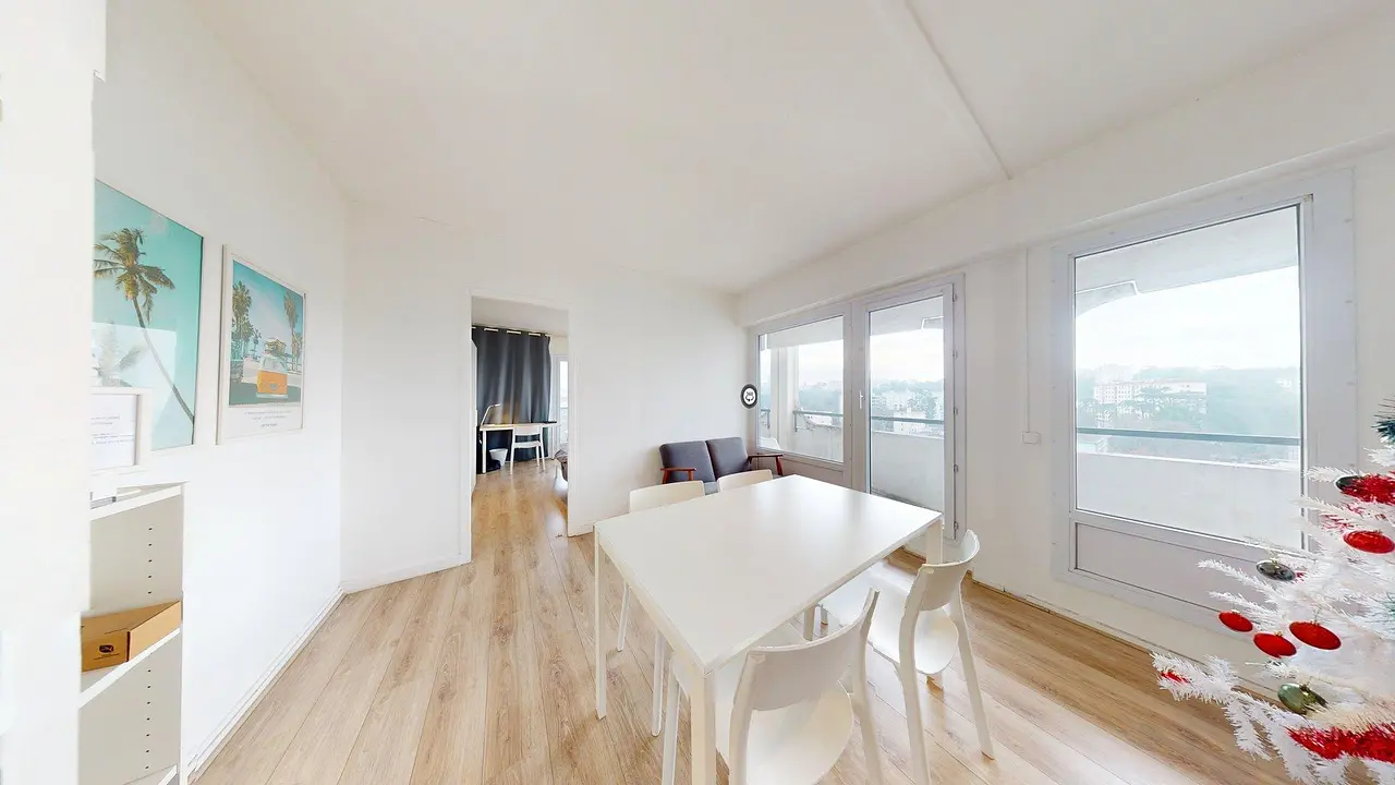 La colocation dispose d’un séjour lumineux grâce à ses larges baies vitrées donnant sur le balcon. Le parquet clair, les murs blancs et le mobilier épuré créent une atmosphère chaleureuse et conviviale. Une table à manger et des assises sont mises à disposition pour partager les repas ou travailler au calme.
