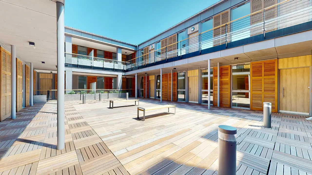 Le logement se situe au rez-de-chaussée, dans un ensemble de logements neufs et organiser autour d’une grande terrasse commune en bois.
