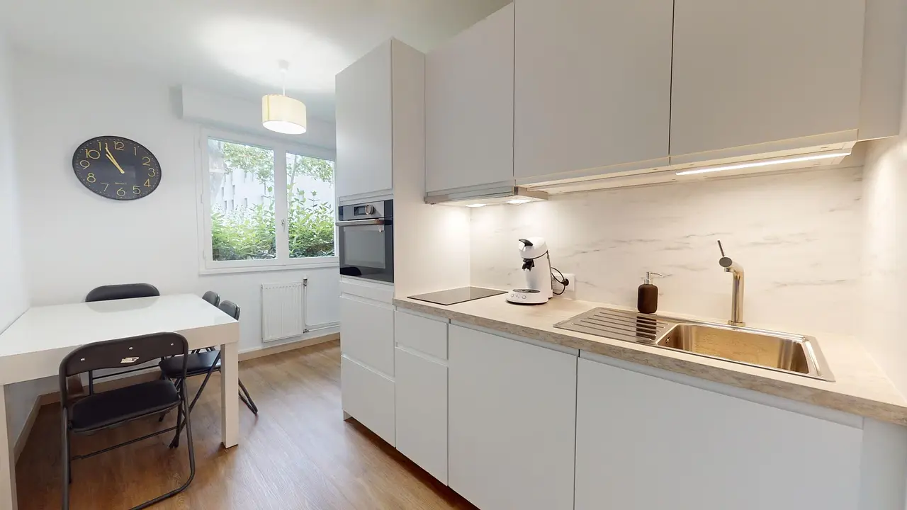 La cuisine est équipée d'un four, de plaques de cuisson, d'une hotte, d'un réfrigérateur, d'un évier, de nombreux rangements et de tous les ustensiles et le petit-électroménager nécessaire. Cet espace accueille également une table avec 4 chaises, parfait pour partager des repas entre colocs.