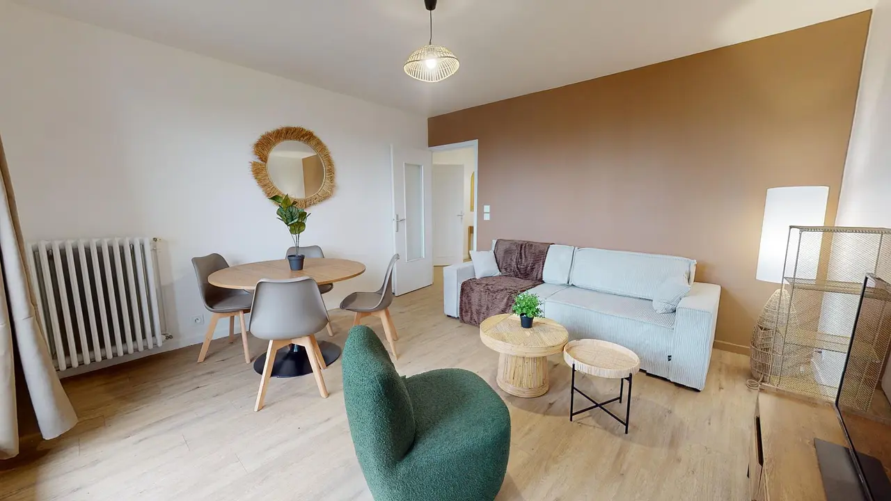 Le salon est aménagé avec un canapé très confortable, deux tables basses, une étagère, un fauteuil, un meuble avec sa TV et une table à manger pour 4 personnes idéale pour partager des repas entre colocs.