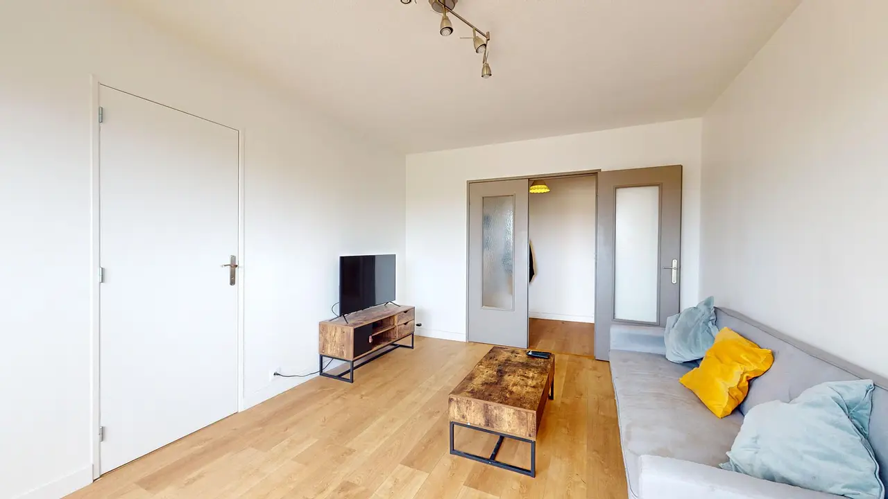 Cette colocation de trois chambres s'ouvre sur une entrée avec un meuble à chaussures et un porte-manteau. Le séjour est aménagé d'un canapé, d'une table basse et d'un meuble TV avec une télévision.