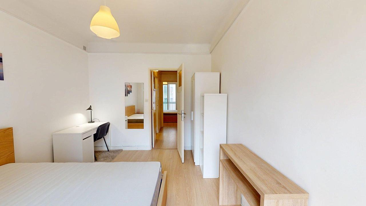 Première chambre (12,5 m²) : lit double, table de chevet, bureau, miroir, armoire et étagère. Elle donne accès au balcon.