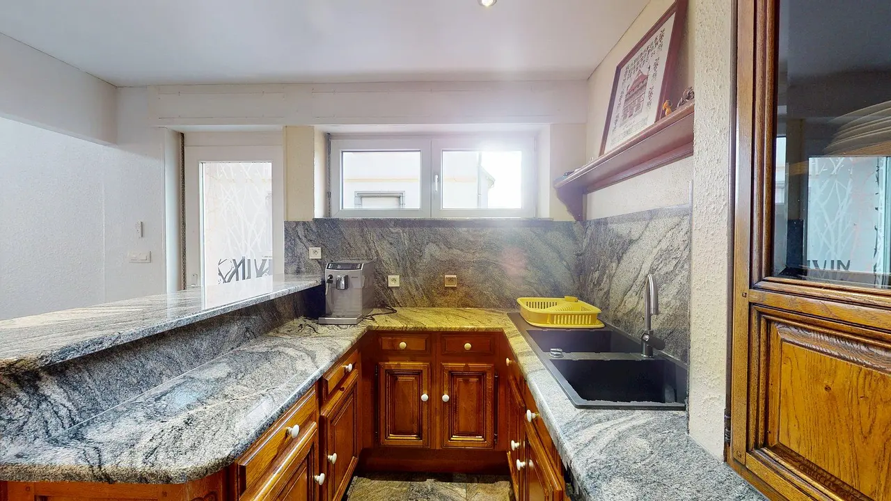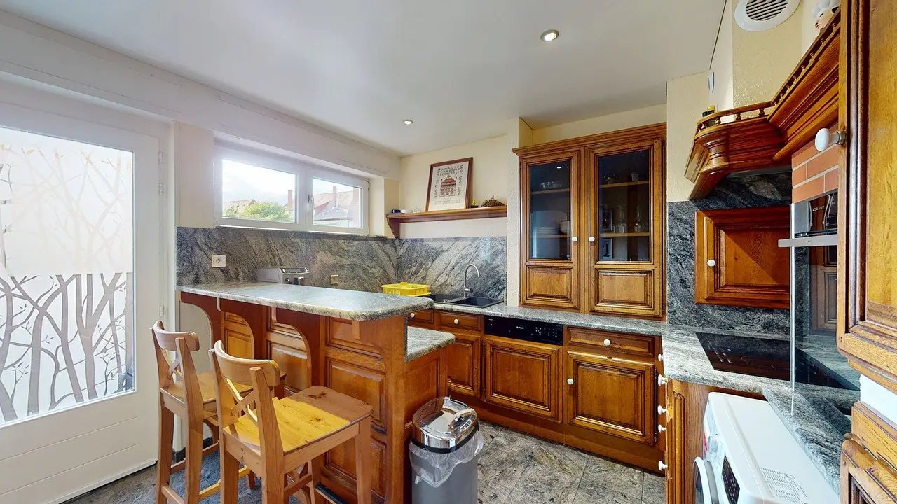 La cuisine séparée est équipée d'un four, de plaques de cuisson, d'une hotte, d'un évier, d'un réfrigérateur avec compartiment congélateur, lave-vaisselle, lave-linge séchant, ainsi que de nombreux rangements et ustensiles de cuisine. Elle possède également un mange-debout.