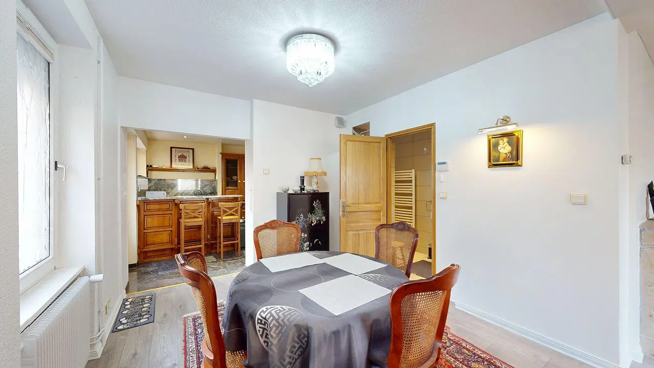 La pièce de vie est meublée avec une table à manger et ses 4 chaises, un buffet, un canapé, une table basse, un meuble télévision et une télévision.