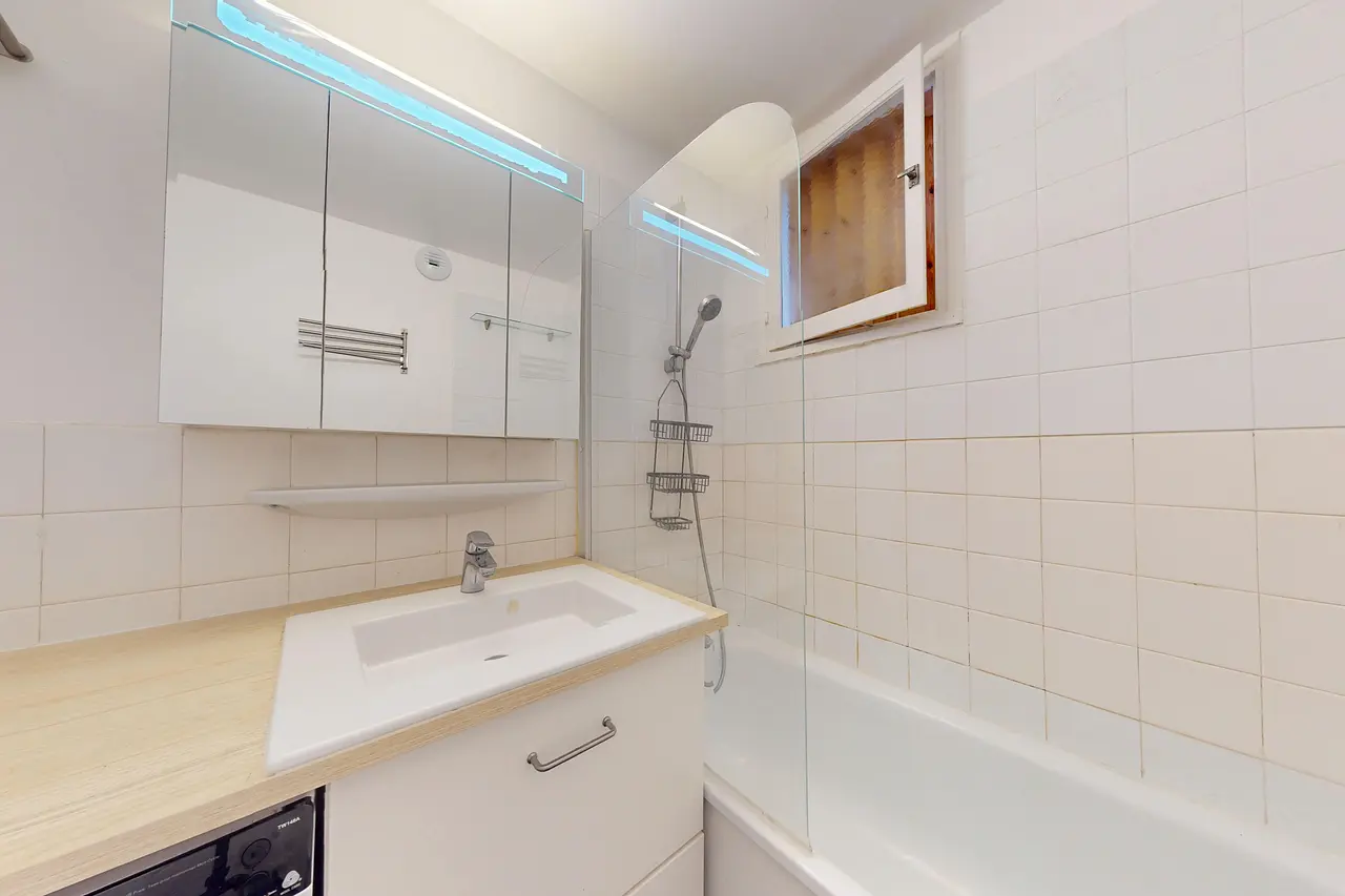 La première salle de bain dispose d'une baignoire, d'un meuble vasque avec un miroir ainsi que d'un lave-linge. La salle d'eau se compose d'une grande douche, d'un sèche-serviettes ainsi que d'un meuble vasque avec un miroir.