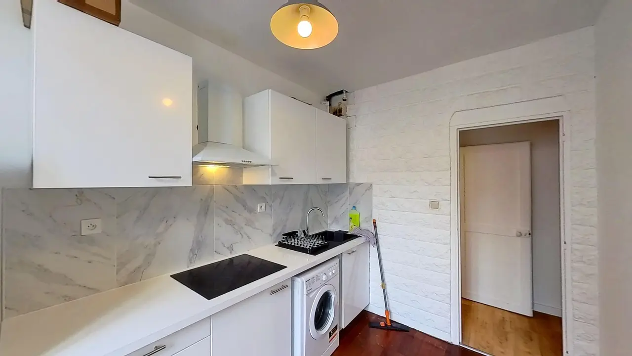 La cuisine est équipée d'un réfrigérateur congélateur, d'un micro-ondes, d'une machine à laver, de plaques de cuisson avec une hotte, d'un évier avec égouttoir ainsi que de nombreux rangements.