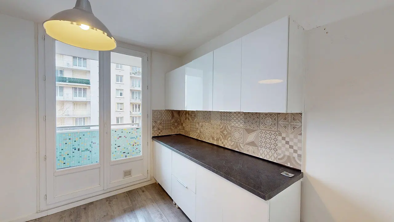 La cuisine séparée et semi-équipée comprend des plaques de cuisson, une hotte et un four. Elle dispose de nombreux rangements ainsi que d’un grand plan de travail, offrant un espace confortable pour cuisiner. La cuisine donne également accès à un second balcon.