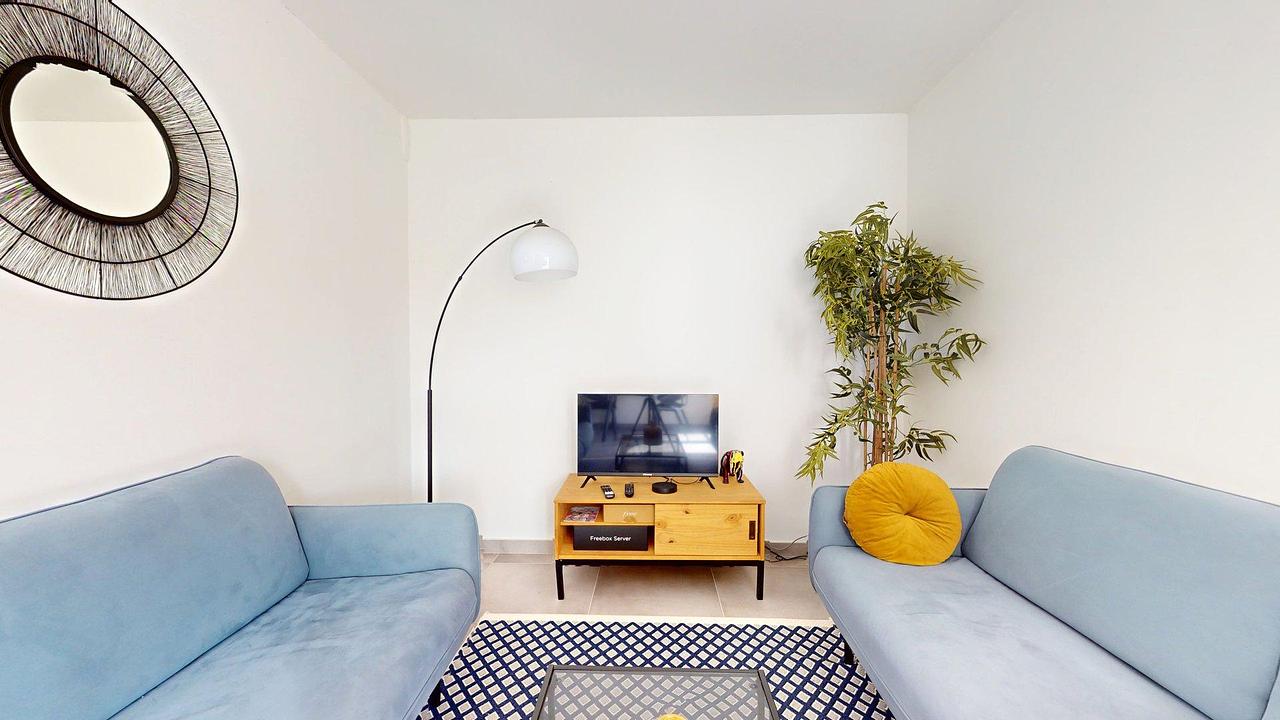 La pièce de vie est meublée avec deux canapés, une table basse, un meuble télévision, une télévision ainsi qu'une table à manger et ses 4 chaises.