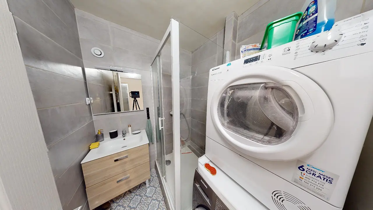 L'appartement dispose d'un grand séjour meublé d'un canapé deux places, d'une table basse et d'un meuble TV. Une cuisine séparée est également disponible, équipée d'un mange-debout, d'un four traditionnel, d'un four à micro-ondes, de plaques de cuisson, d'une hotte, d'un lave-vaisselle et d'un réfrigérateur avec compartiment congélateur. Deux salles de bain viennent compléter ce bien, toutes deux équipées d'une douche, d'un meuble vasque, et d'une machine à laver et d'un sèche linge.
