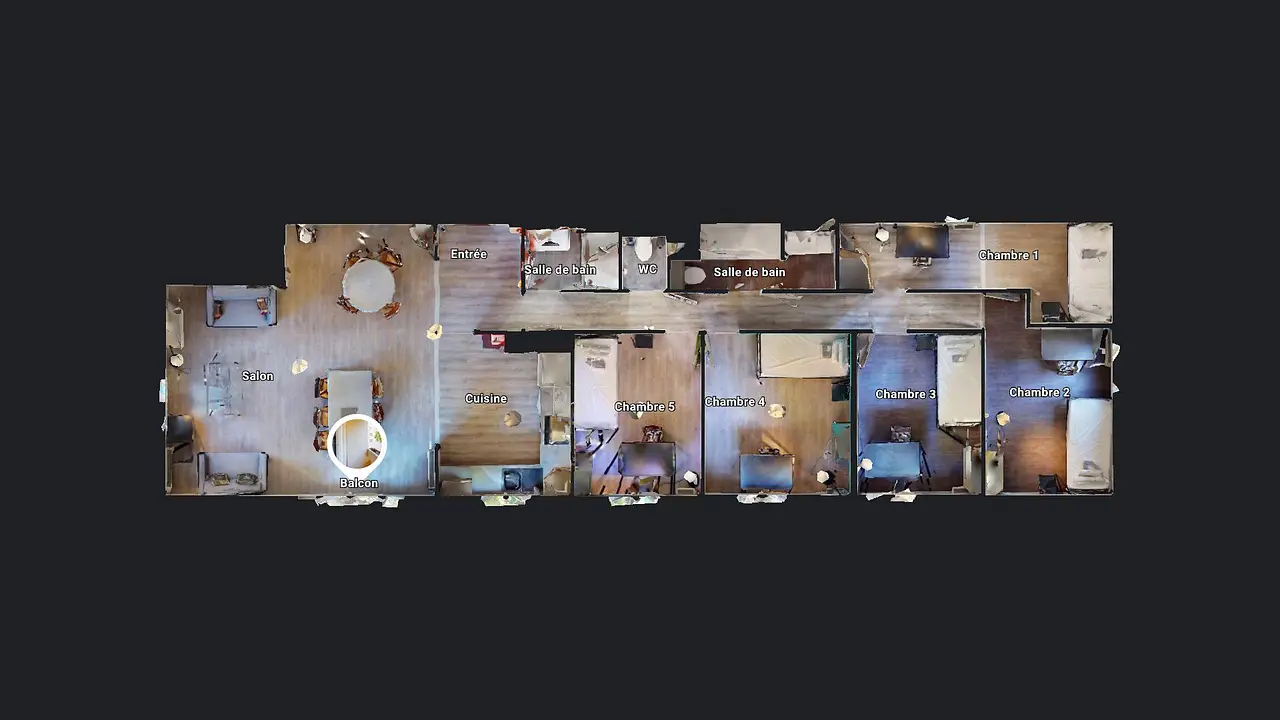 Cette colocation comporte un très grand séjour avec balcon donnant sur cuisine ouverte. Le séjour est aménagé avec deux canapés, deux tables à manger et des tables basses.