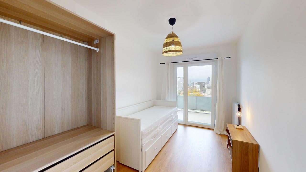 La deuxième chambre est équipée d'un lit tiroir, d'un placard et offre également un accès au balcon.