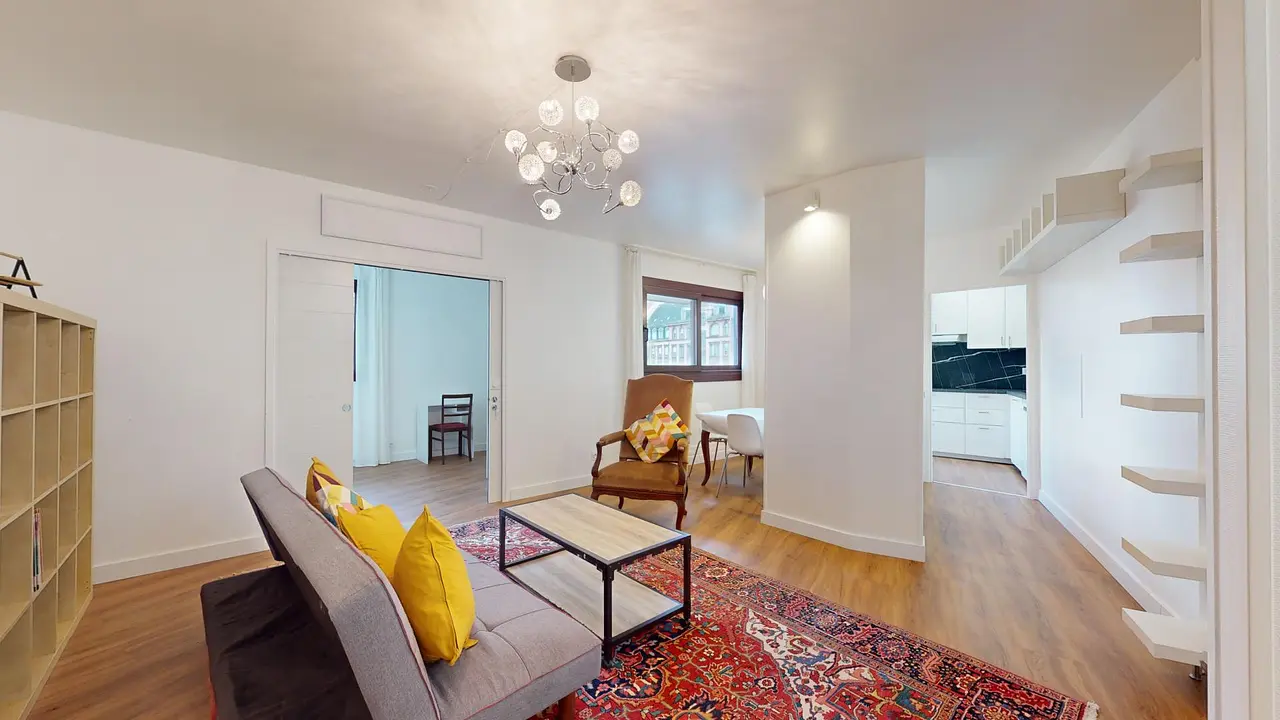 Il possède une belle pièce de vie meublée avec canapé, table basse, tapis, fauteuil et rangements. Une table à manger est aussi présente. La cuisine, séparée,