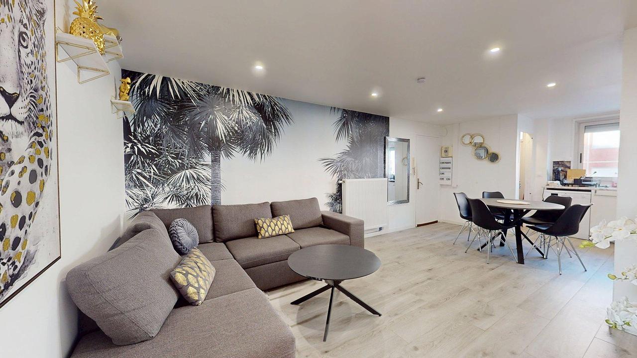 Cette colocation s'ouvre sur une grande pièce de vie lumineuse aménagée d'un canapé d'angle, d'une table basse, d'un meuble TV avec télévision ainsi que d'une table avec cinq chaises, idéal pour partager des repas entre colocataires.
