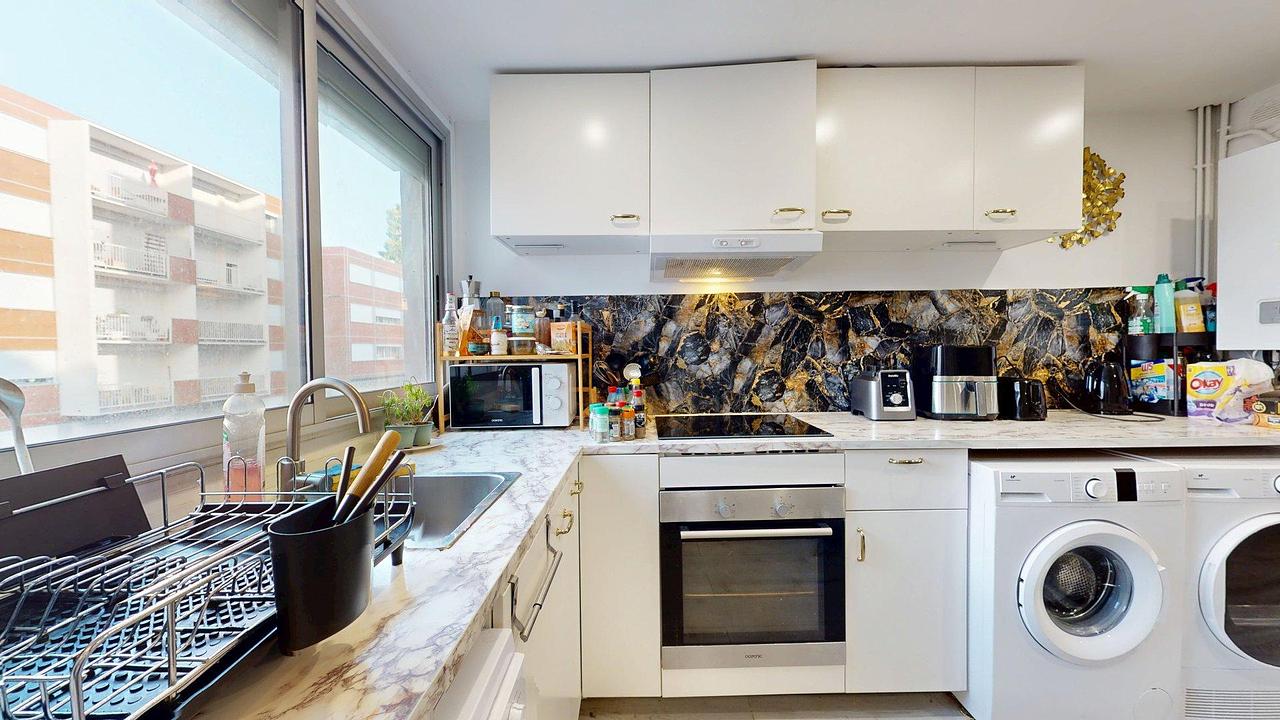 La cuisine ouverte est équipée d'un réfrigérateur congélateur, d'un lave-vaisselle, d'une machine à café, d'un évier avec égouttoir, d'un four, de plaques de cuisson avec une hotte, d'un air-fryer, d'une machine à laver, d'un sèche-linge, d'un grille-pain, d'une bouilloire ainsi que de nombreux rangements.