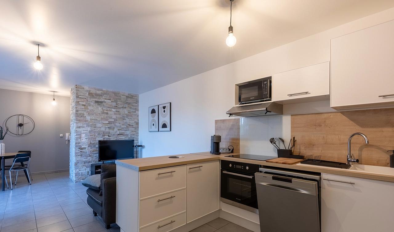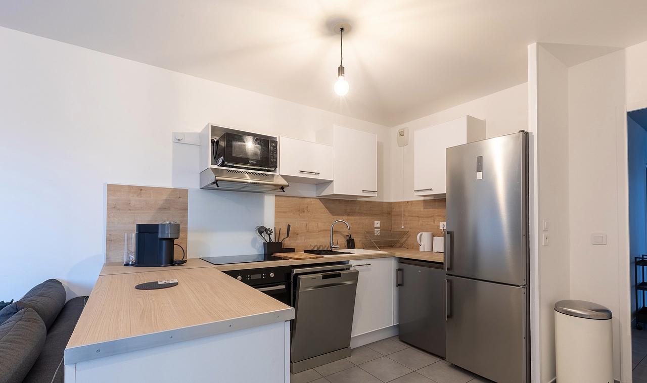 La cuisine est équipée d'un four, d'un micro-ondes, de plaques de cuissons, d'une hotte, d'un lave-vaisselle, d'un évier, d'un réfrigérateur ainsi que de nombreux rangements.
