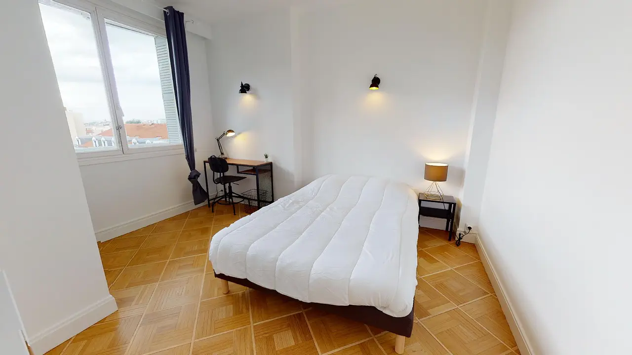 La première chambre est équipée d’un lit double, d’un bureau, d’une table de nuit avec lampe de chevet. Un placard mural avec deux portes-coulissantes offre un espace de rangement suffisant.