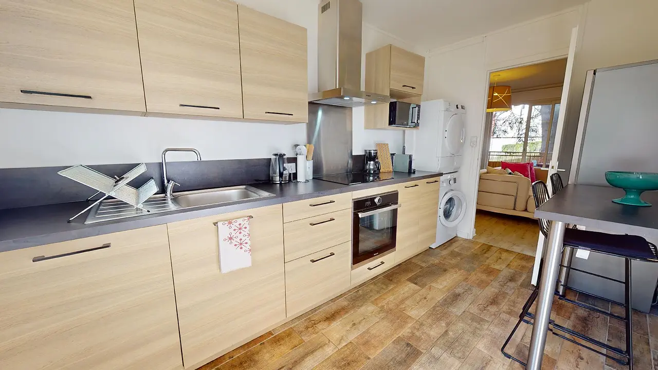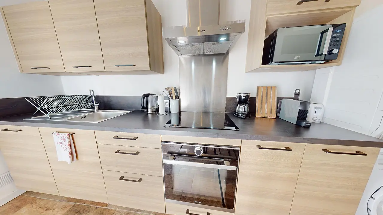 La cuisine, qui est indépendante, est équipée de manière complète, avec un four, des plaques de cuisson et une hotte, un four à micro-ondes, une machine à laver et un sèche-linge, une bouilloire, un grille-pain, ainsi que de nombreux espaces de rangement et des ustensiles de cuisine.