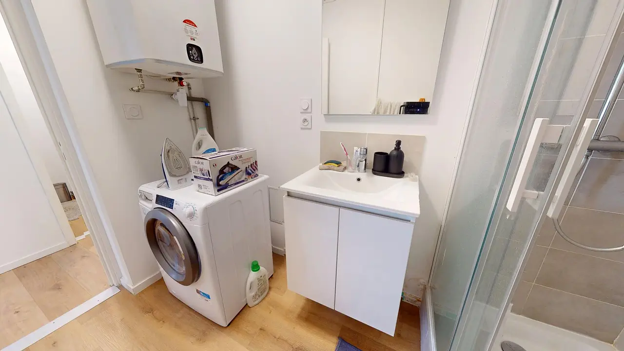 La salle de bain comprend un meuble vasque avec miroir ainsi qu'une douche.