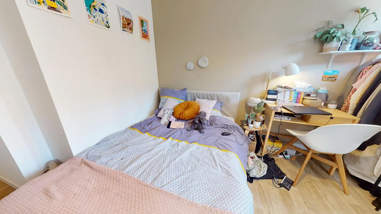 Elle est équipée d'un lit double, d'un bureau, d'un placard de rangement et d'une commode de chevet.
