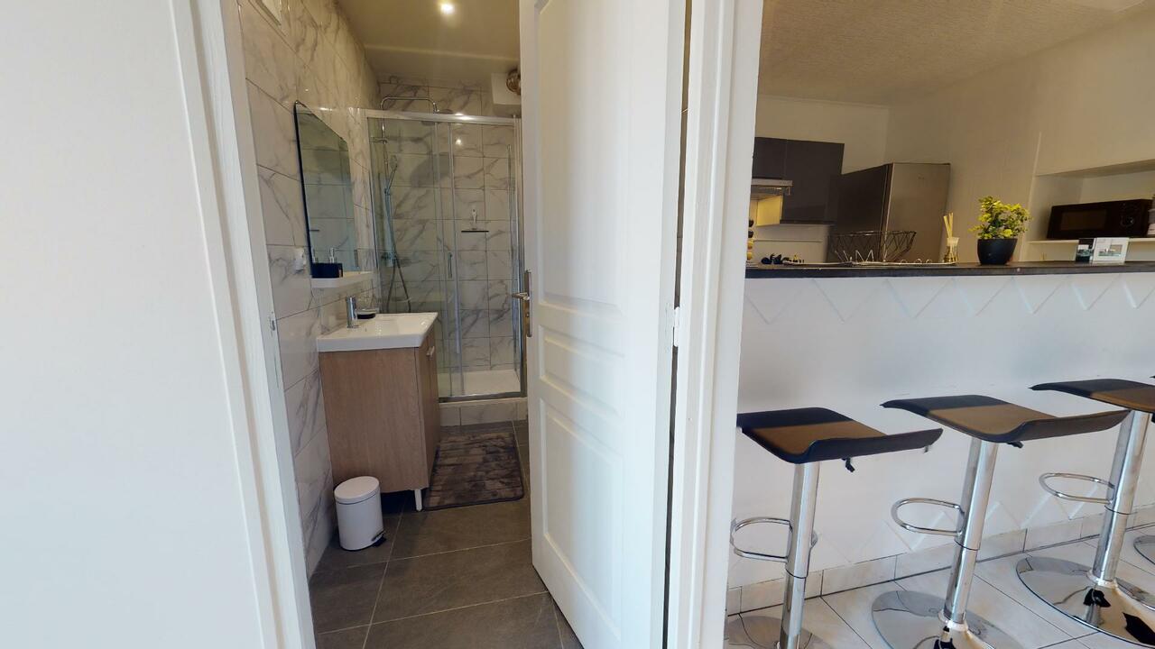 La colocation s'ouvre sur un couloir donnant accès à la salle de bain, et amenant sur une cuisine ouverte avec bar mange-debout. La salle de bain est équipée avec douche, meuble vasque et sèche serviette.