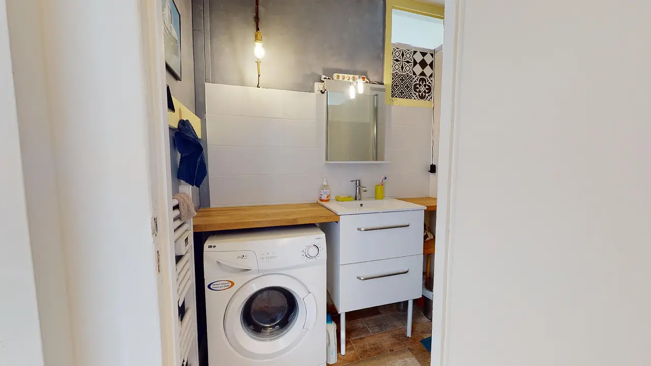 La salle de bain se compose d’une grande douche, d’un meuble vasque, d’une machine à laver et d’un sèche serviette.
