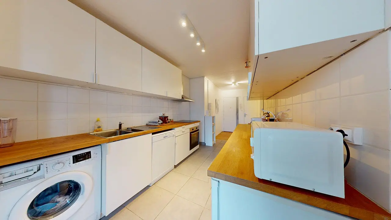 L’appartement s’organise autour d’une cuisine séparée, spacieuse et entièrement équipée. Elle dispose de nombreux rangements, d’une plaque de cuisson, d’un four, d’un micro-ondes, d’un lave-vaisselle, d’un lave-linge et d’un réfrigérateur.