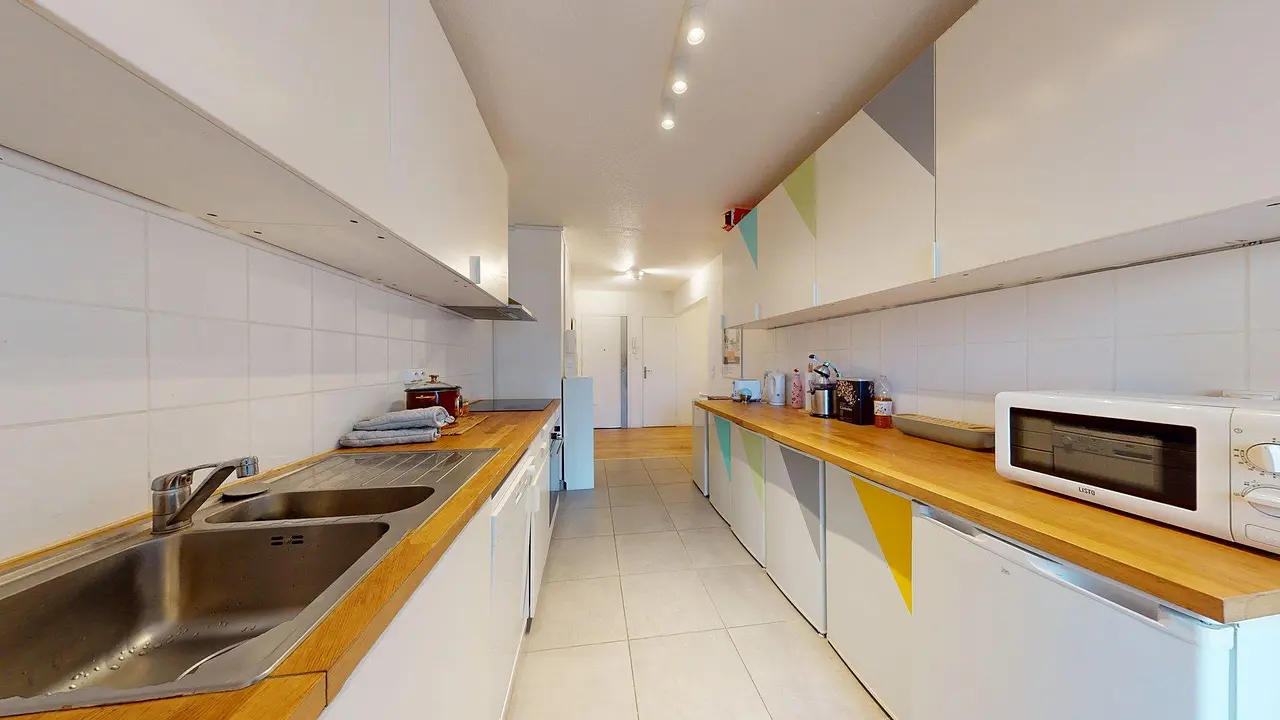 Chaque locataire bénéficie également de son propre réfrigérateur et d’un placard attribué par code couleur, permettant à chacun de disposer de son espace dédié.