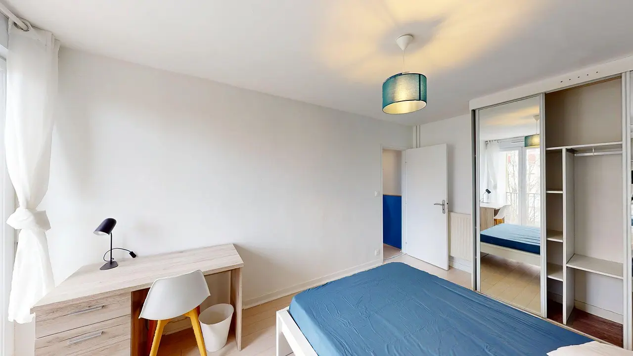La chambre 1 est équipée d’un lit double, d’un bureau, d’un placard de rangement ainsi que d’une table de chevet.