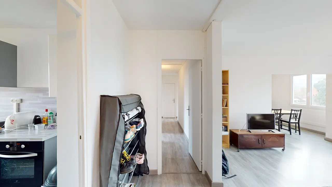Cette colocation de trois chambres s'ouvre sur une grande pièce de vie avec un coin salon et un coin salle à manger. Elle est aménagée d'un canapé, d'un fauteuil, d'une table basse, d'une bibliothèque, d'un meuble TV avec une télévision ainsi que d'une table avec quatre chaises, idéal pour partager des repas entre colocataires.