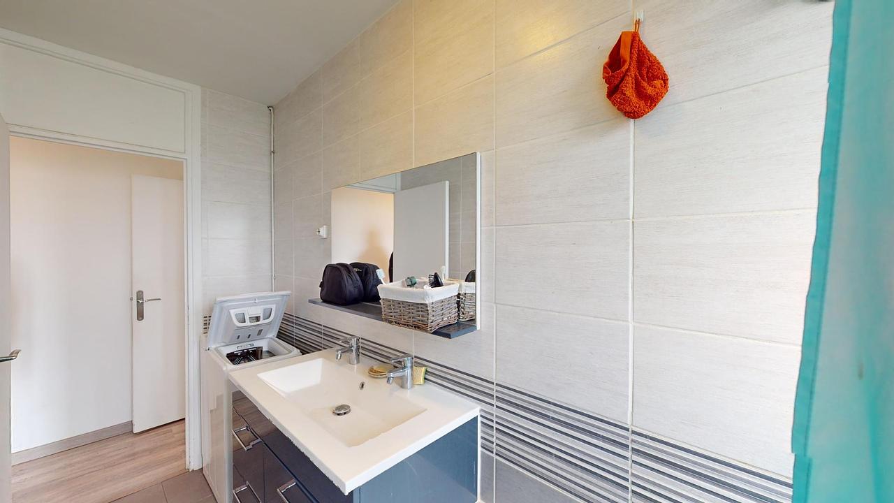 La salle de bain dispose d'une baignoire, de portes serviettes, d'un grand meuble vasques avec un miroir ainsi que d'une machine à laver. Les toilettes sont séparées.