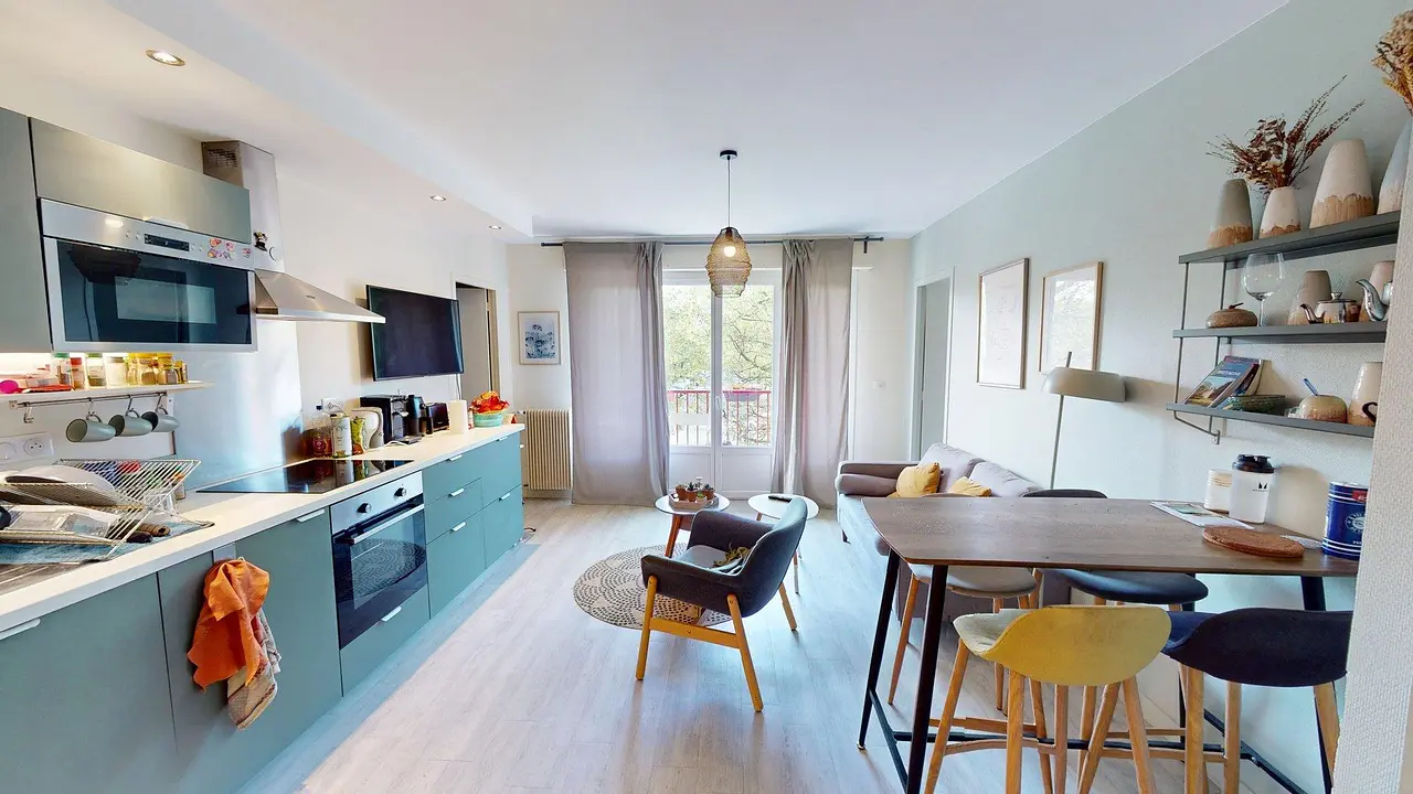 Cette colocation s'ouvre sur une pièce de vie lumineuse, aménagée d'un canapé, de tables basses, d'une télévision, d'un fauteuil, d'une table haute avec quatre chaises, idéal pour partager des repas entre colocataires.