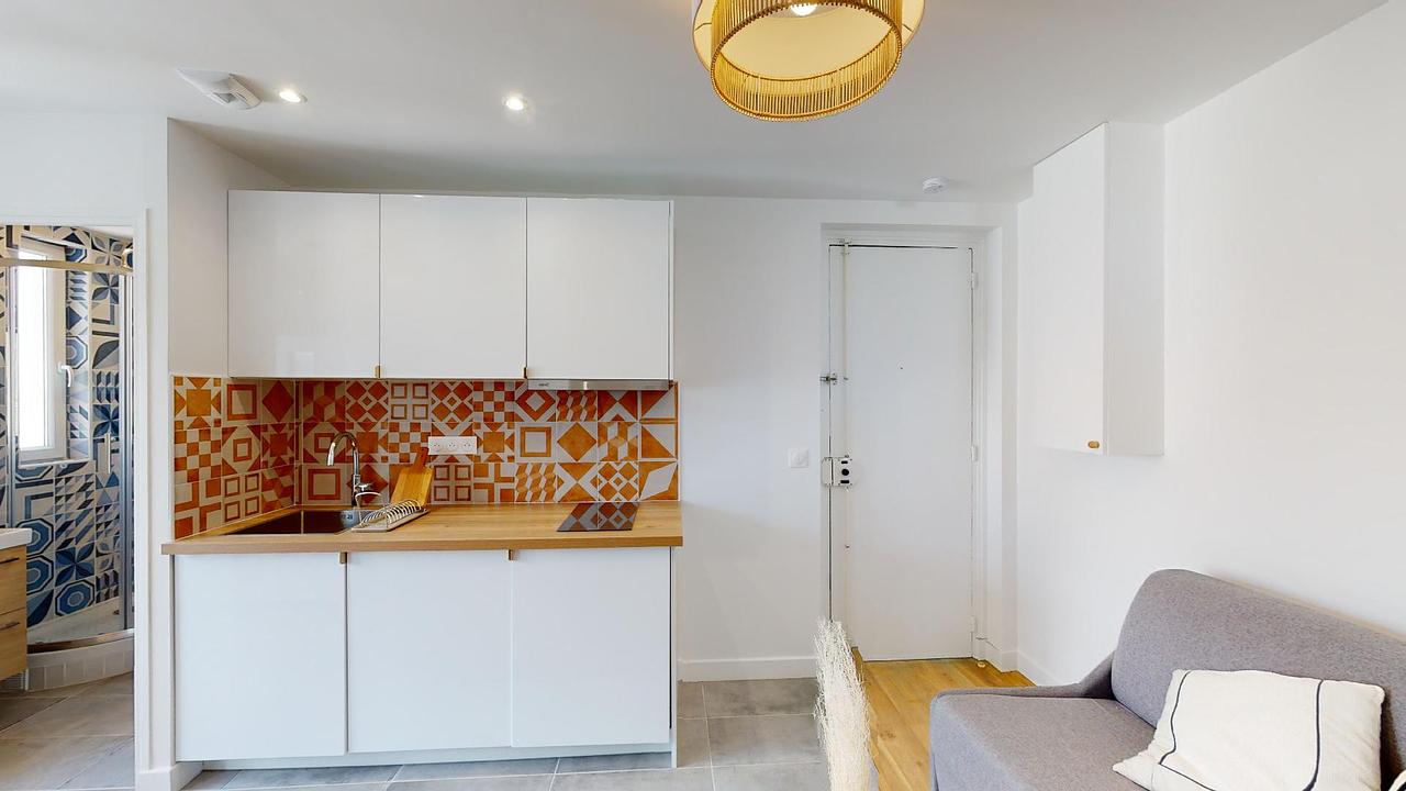 Le studio est lumineux et a été très joliment agencée. Il dispose d’un espace cuisine (équipée de plaques de cuisson et de rangements), d’un espace de vie convertible en espace de nuit grâce à son canapé dépliant, d’une table à manger accompagné de ses chaises et d’un TV murale. Une salle de bain neuve et séparée se découvre, munie de meuble vasque, de sa douche et d’un toilette.