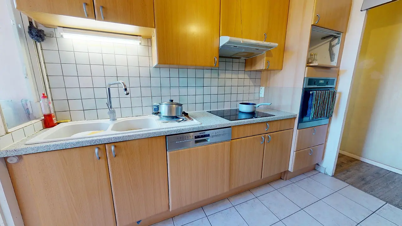 Cet appartement de 4 pièces comporte trois chambres, une cuisine avec un four, un lave-vaisselle, un micro-ondes ainsi qu'une plaque de cuisson et une salle de bains équipée d'une douche ainsi que d'un meuble vasque.