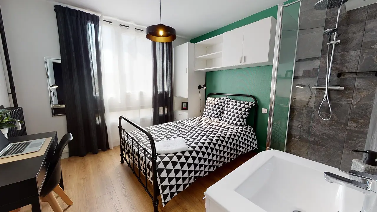 Équipements : un lit double, un bureau, une chaise, des rangements, etc.