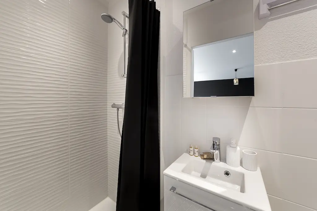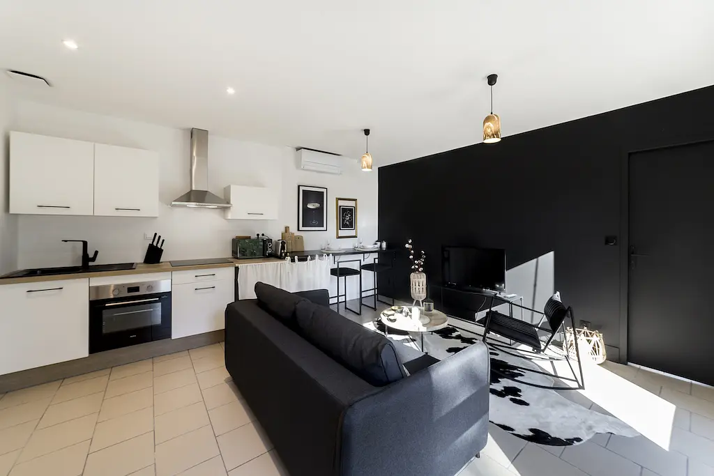 Cet appartement est composé d'un salon avec un canapé, un fauteuil, une table à manger ainsi qu'une télévision, d'une chambre, d'une cuisine et d'une salle de bains équipée d'une baignoire ainsi que d'une douche.