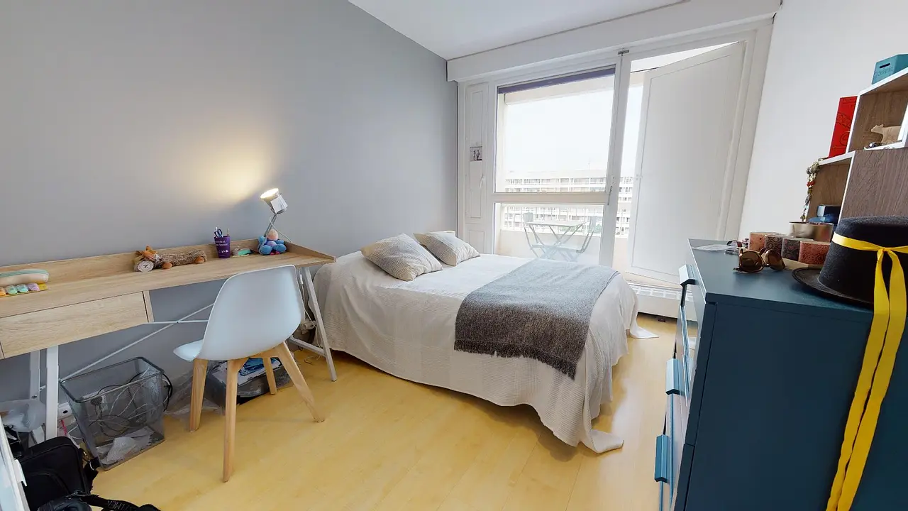 La chambre 4 est particulièrement agréable du fait de sa récente rénovation et grâce à son accès au balcon. Meublée avec goût, elle dispose d’un grand placard avec espace penderie et tiroirs, d’un lit double, d’un beau bureau et, au mur, d’un grand miroir. La literie étant fournie, elle offre tout le confort qu’on attend pour emménager rapidement.