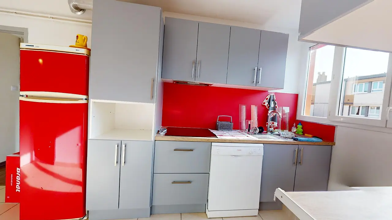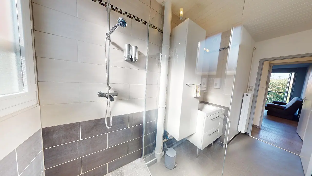 Cet appartement de 5 pièces est composé comme suit : un salon, une cuisine et une salle de bains avec douche.
