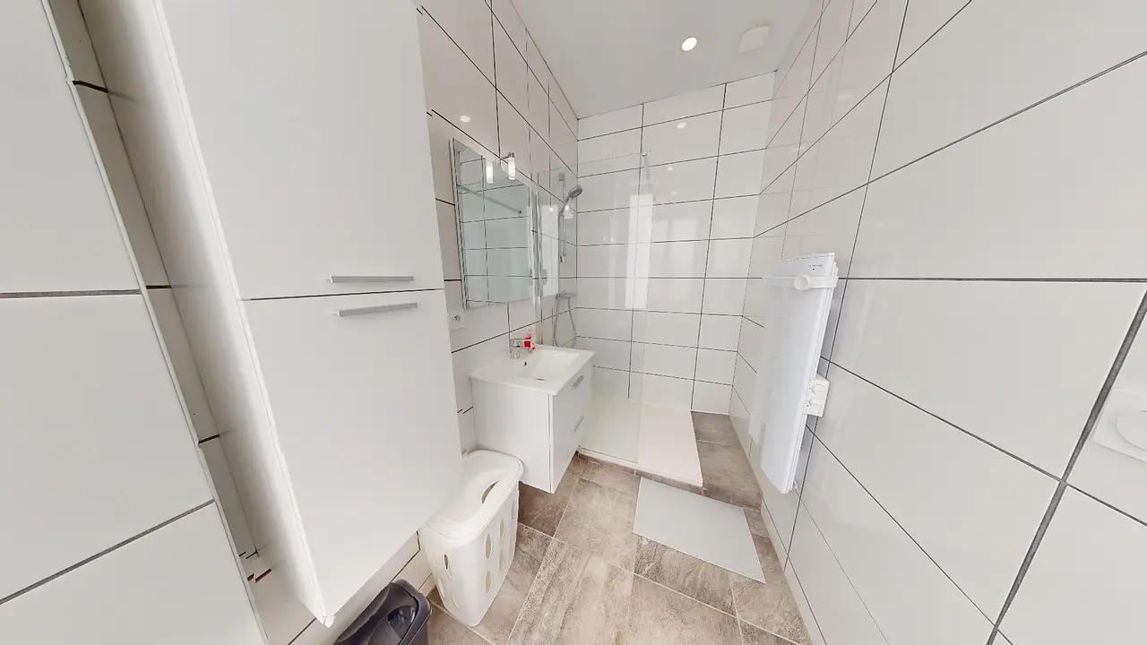 La salle de bain comprend une douche, un lavabo avec rangement, ainsi qu'un WC pour votre confort.