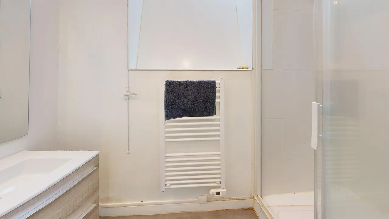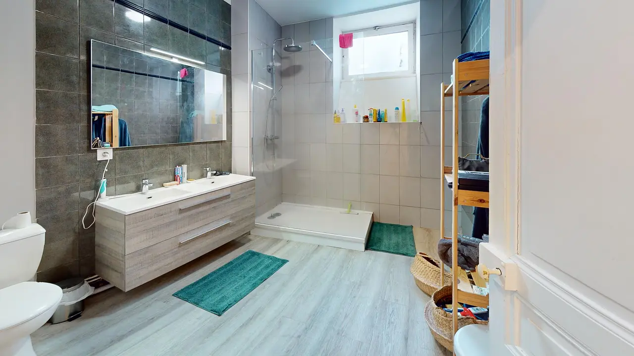 L'appartement dispose de deux salles d'eau, toutes deux pratiques et bien aménagées. La première comprend une douche, un meuble vasque avec miroir, un sèche-serviettes et des rangements. La seconde offre une grande douche, une double vasque avec miroir, un grand espace de rangement, ainsi que des WC.