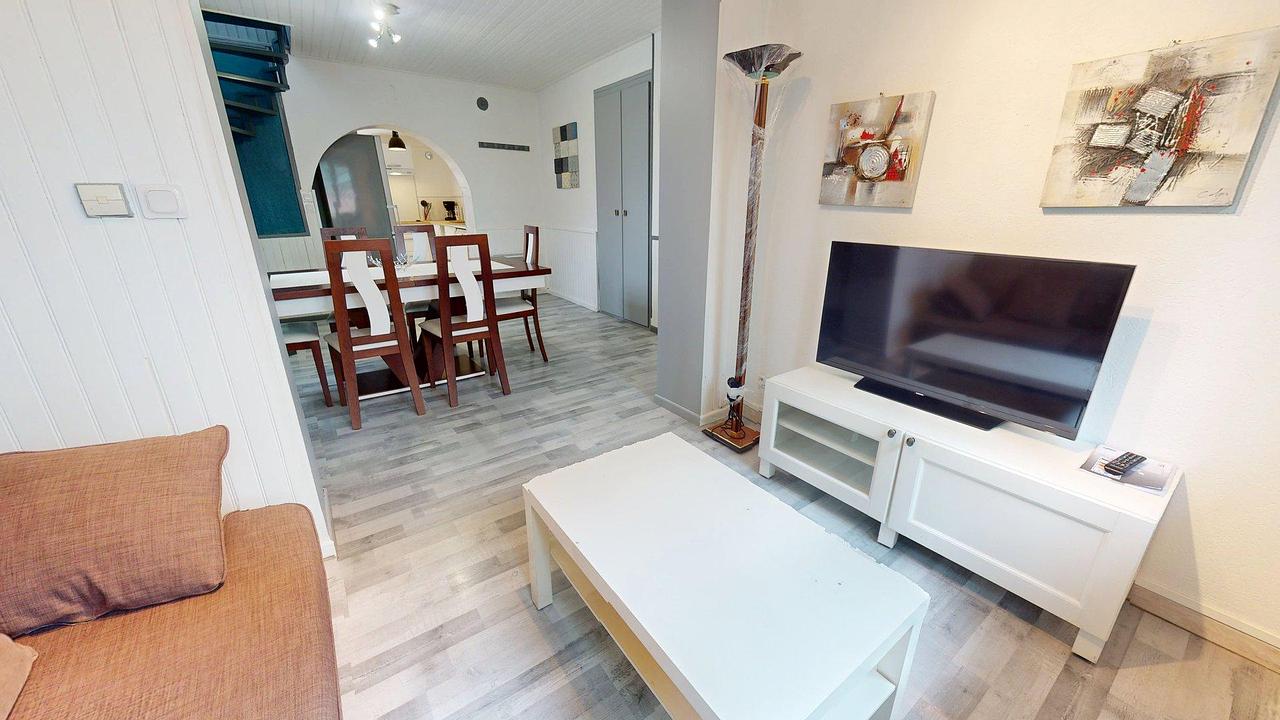 La pièce de vie est meublée avec un canapé convertible, une table à manger et ses chaises, un meuble télévision, une télévision, une table basse, et de grands placards.