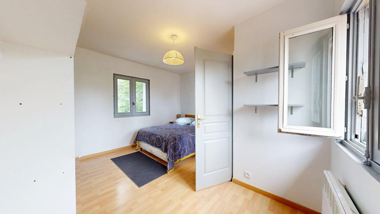 La chambre est meublée avec lit double, commode de rangement ainsi que table de chevet.