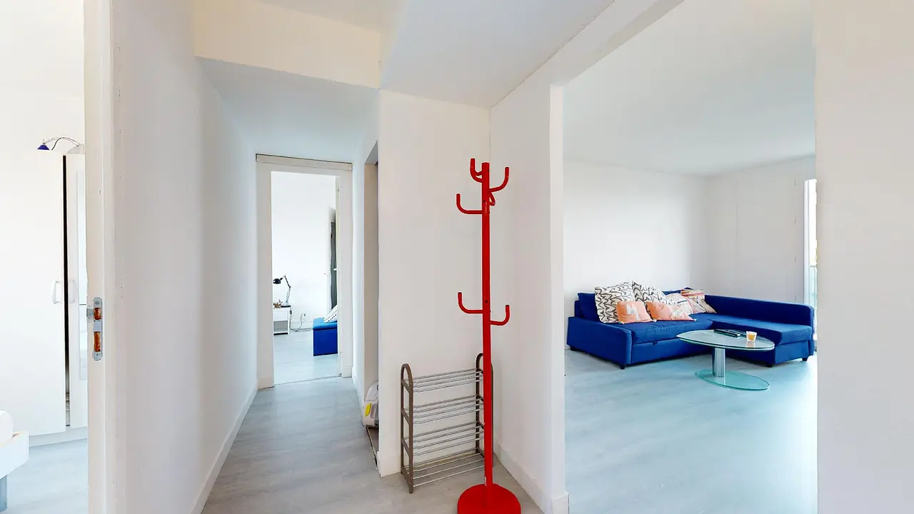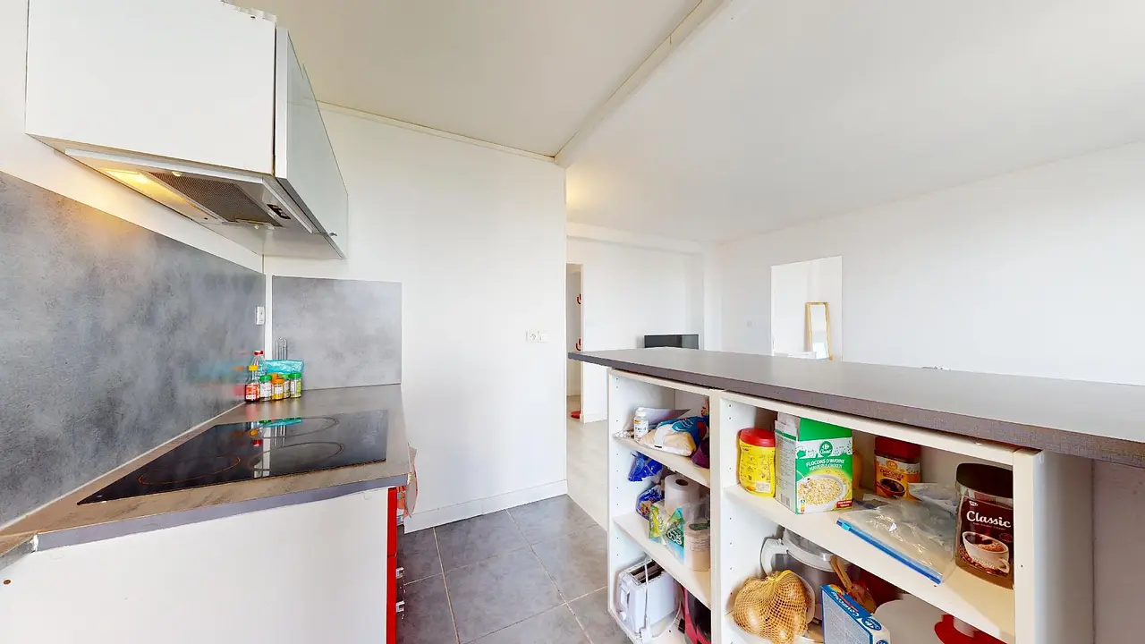 Cette colocation de trois chambres s'ouvre sur une pièce de vie avec un coin salon et un coin cuisine séparé par un bar avec trois tabourets.