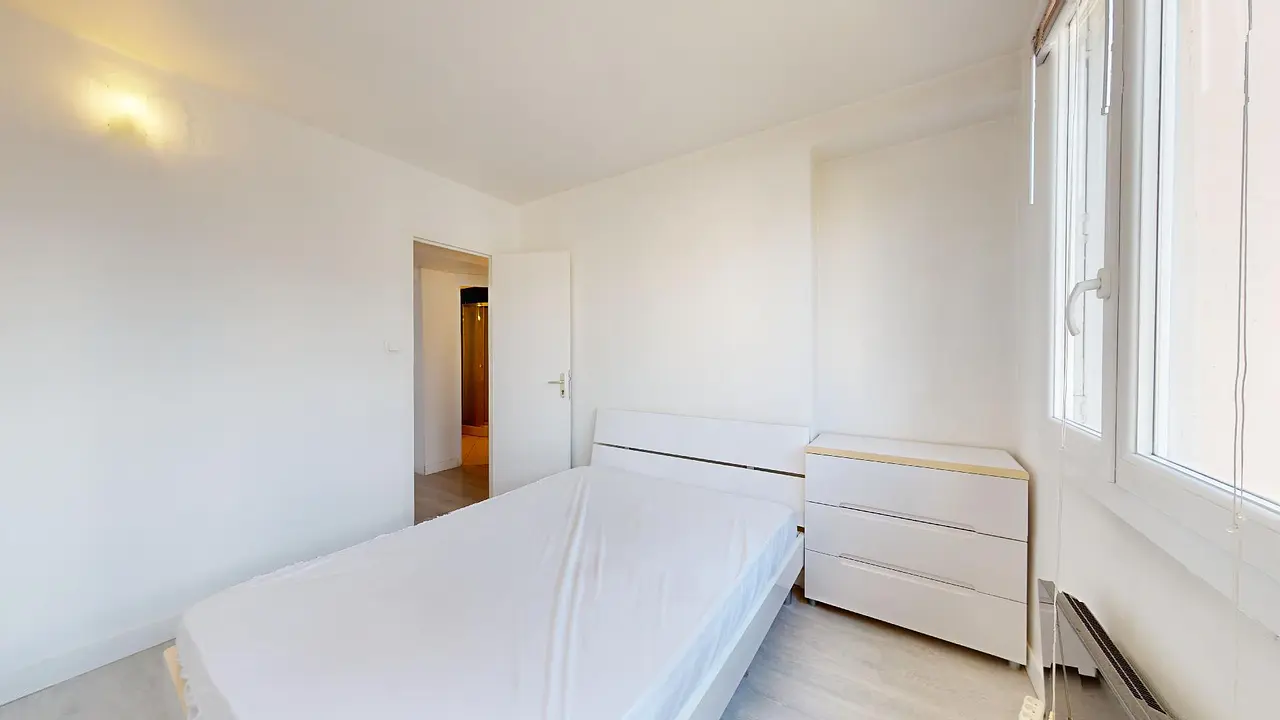 Cette colocation dispose d'un lit double, une commode, un bureau avec une chaise et une armoire.